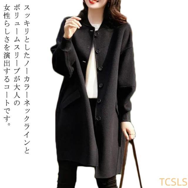 ノーカラーコート ロングコート ニットメルトン レディース 春秋冬 ロング 無地 ミドル丈 膝上 ボリューム袖 韓国風 秋アウター 春アウター ゆったり クルーネック ボリュームスリーブ 袖リブ おしゃれ きれいめ ゆったり 羽織る 黒コート 20代 30代 40代 50代