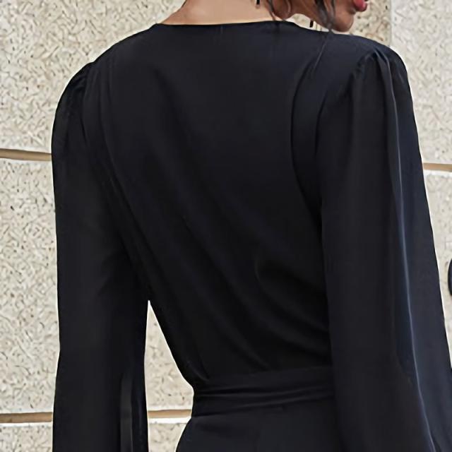オールインワン ジャンプスーツ レディース 長袖 長ズボン ロングパンツ Vネック カシュクール ウエストリボン セクシー つなぎ 無地 シンプル 大
