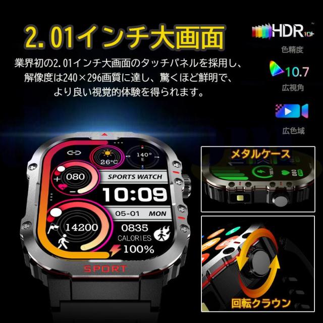 【IP68防塵防水&軍用規格スマートウォッチ】このスマートウォッチは業界最高水準のIP68防塵防水機能を実現、水や汗による故障の心配なく利用できます。本スポーツウォッチは屋外や、粉塵の舞う製造工場で使用することができ、防塵防滴、耐衝撃、耐高温/耐低温性能などの頑丈設計を行い、多くの軍用標準テストに合格することができます。また、高精細で美しい色を表現できる2.01インチタッチディスプレイを搭載し、視認性に優れた高解像度大画面を採用され、画質がより鮮明になり、より高精度な大画面で文字を表示されます。例のない快適な視覚感と優れた操作感をもたらします。