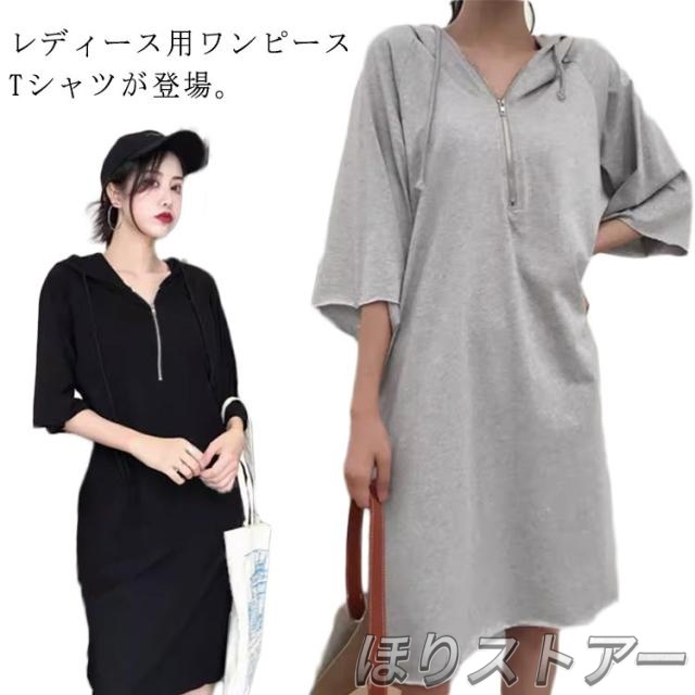 tシャツ ロングTシャツ ワンピース 夏 5分袖 フード付 春夏 トップス オーバー 春 ビッグtシャツ ワンピースTシャツ tシャツ 夏 カットソー シンプル 無地 五分袖 ビッグシルエット Tシャツ 大きいサイズ トレーニング