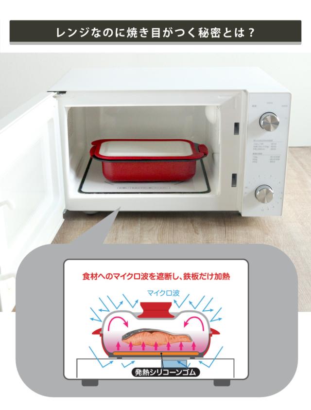 電子レンジのマイクロ波を直接食材に当てず、底面の発熱素材に当てる事でその部分だけが熱されて、まるでフライパンで焼いたような焼き目をつけることができます。