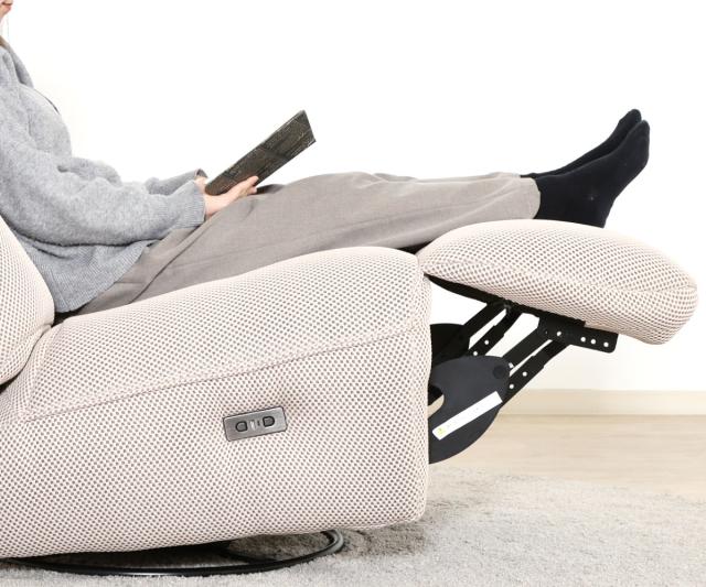 背もたれはボタン操作で無段階にリクライニング可能。読書や映画観賞、くつろぎタイムなど、シーンに応じて角度を細かに調整できます。