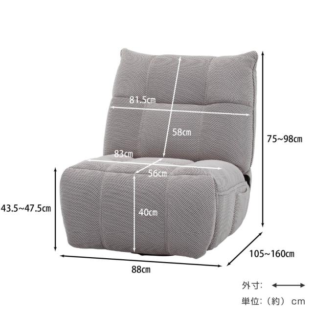 幅88cmのコンパクトな一人掛けチェアです。奥行は105〜160cm、高さは75〜98cmまで幅広く調整可能。限られた空間にもすっきり収まりつつ、自在にフィットする設計です。