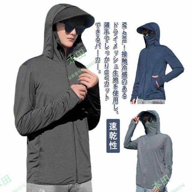 UVカット パーカー メンズ 薄手 接触冷感 日焼け止め パーカー 指穴付き フード付き フェスカバー付き ドライメッシュ uvパーカー ラッシュガー