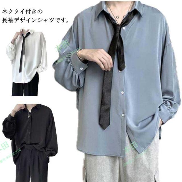 カジュアルシャツ メンズ 長袖 シャツ ネクタイ付き 韓国ファッション 春 秋 ゆったり トップス ビッグシルエット 無地 白シャツ おしゃれ ストリ