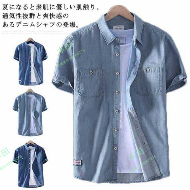 デニムシャツ 半袖 メンズ サマーシャツ ボタンシャツ カジュアルシャツ ノーカラー カットソー スリムシャツ 前開き 修身 男性用 細身 カッコイイ