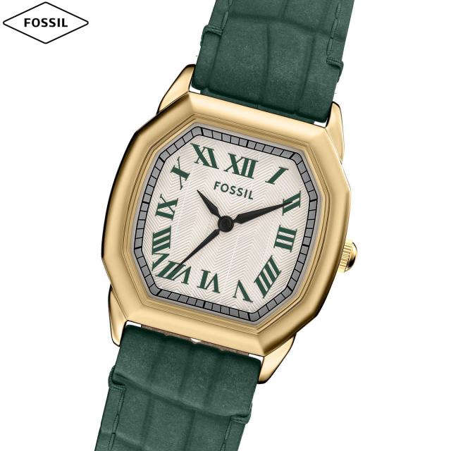 ゴールドトーンの八角形ケースがクリーム色の質感のあるダイヤルを縁取り、この小さなウォッチの特徴的なシルエットを生み出しています。グリーンのクロコ型押しレザーストラップが深みと個性を添え、ケースの温かみのある色調を引き立てています。ステンレススチールとレザーの素材を使用し、考え抜かれたデザインと上質な仕上がりがバランスよく調和しています。【フォッシル FOSSIL 2025 新作】
