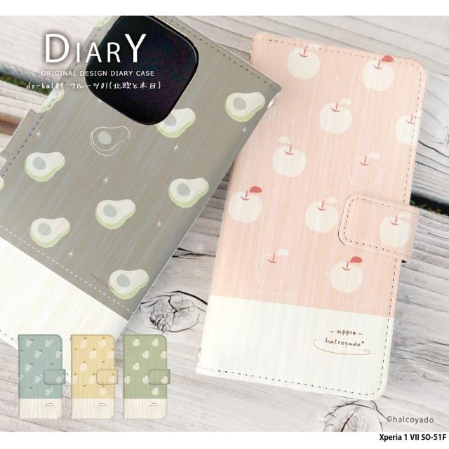 Xperia 1 VII SO-51F ケース 手帳型 xperia1vii エクスペリア1vii カバー デザイン フルーツ01(北欧と木目) フルーツ りんご ぶどう レモン アボカド オレンジ 北欧 くすみカラー おしゃれ