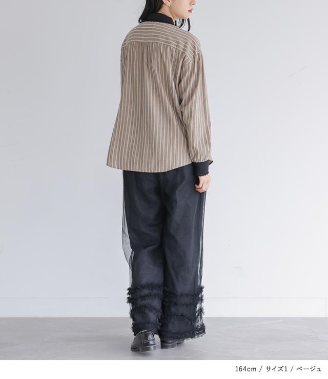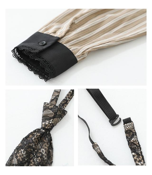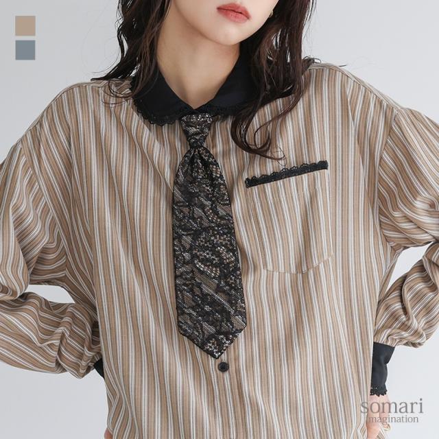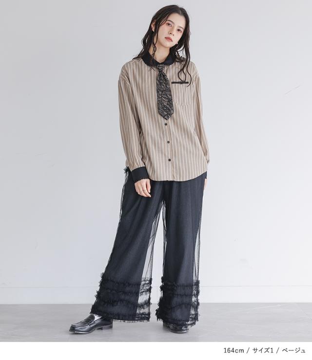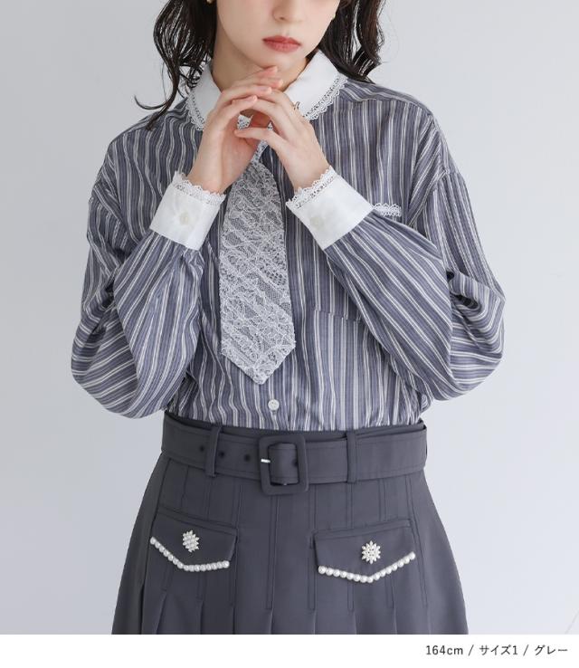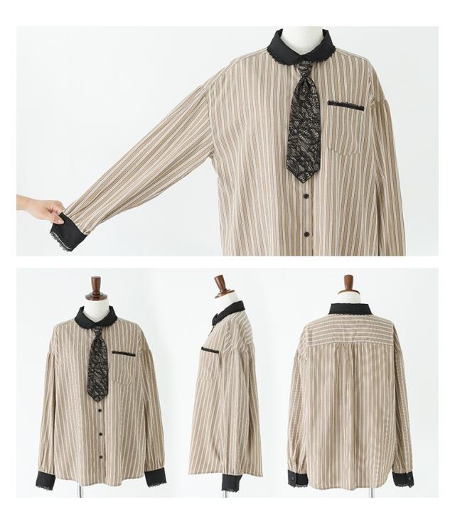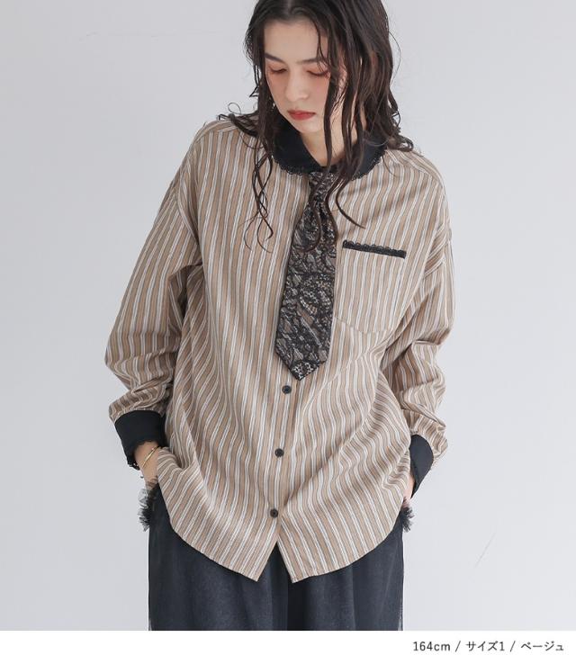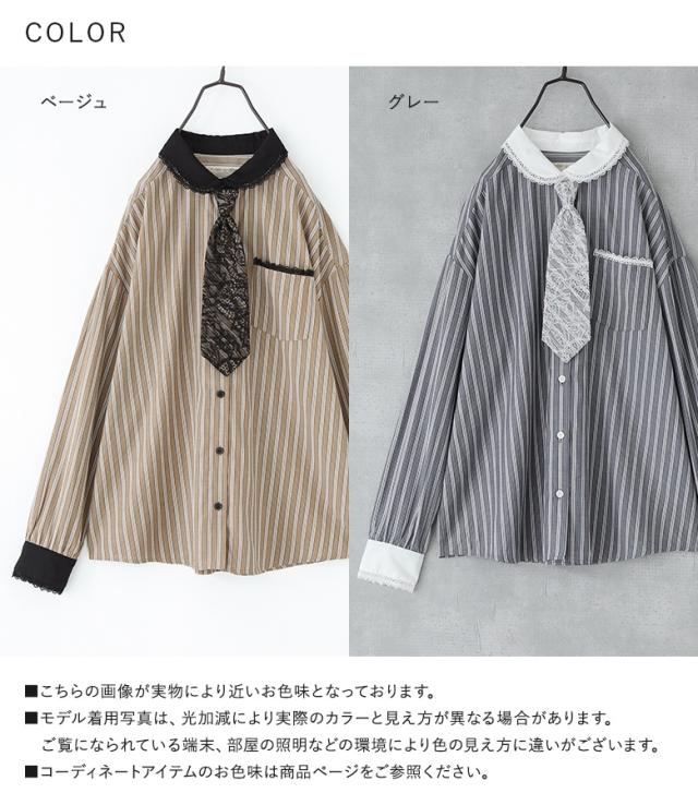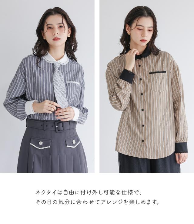 『ネクタイ付きストライプシャツ』※メール便可※【10】[シャツ レディース トップス 長袖 ブラウス ストライプ柄 襟付き 丸襟 ネクタイ付き レース レイヤード 春 秋 冬]