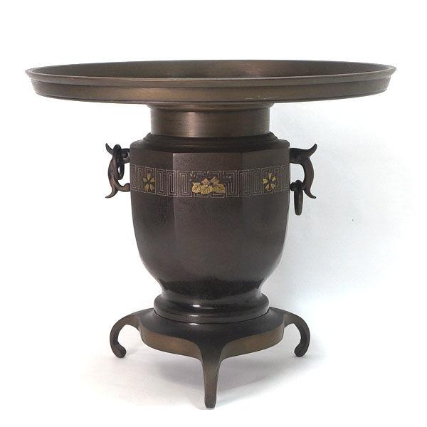 高岡銅器 中光 ◆【花器】高岡銅器/唐金製 中光銘 花紋様 薄端 ギフト銅器 花器 【中古】