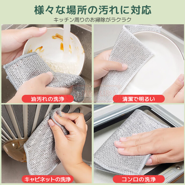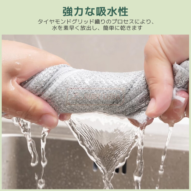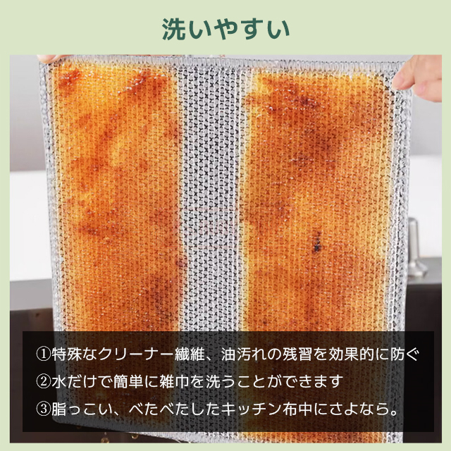 | 【使いやすい】 | ◆リバーシブル キッチンクロスを使って頑固な汚れを簡単に落とします。水を使用するだけで満足な洗浄効果を実現することができ、少量の洗浄剤を使用することができる。クリーン繊維のメッシュ状設計は油脂の残留を防ぎ、べたつきを低減し、キッチンタオルは水で直接洗い流すことができ、しかも乾燥程度は伝統的な綿キッチンクロスの4倍で、急速に乾かし、台所の清潔さと乾燥を保つことができる。 |