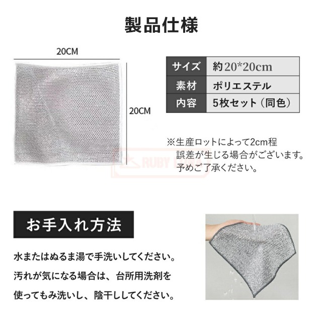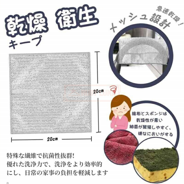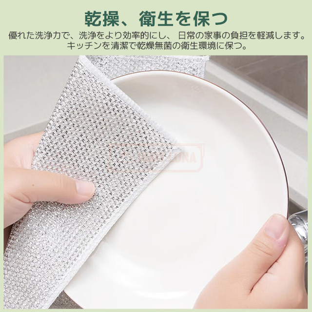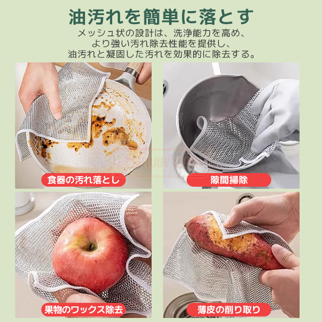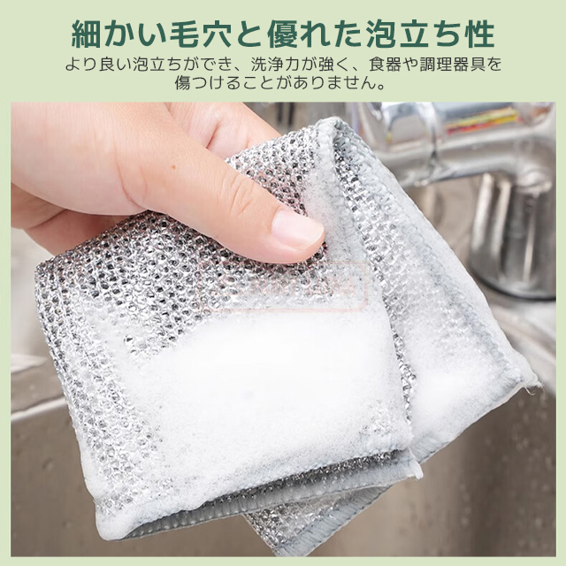 | 【クリーナー繊維材質】 | ◆食器拭き 布巾は良質なPVA材料を使用しており、キッチンに最適なクリーナー繊維材料であり、特殊な加工処理により、ワイヤータオルの柔軟性を一部残すとともに、金属ワイヤー ふきん工具のクリーン能力を有する。洗浄力が群を抜いて、頑固な汚れを効果的に洗浄することができますが、表面を傷つけにくい。セラミック、鉄、ステンレス、コーティング加工に使用できる食器と調理器具。 |
