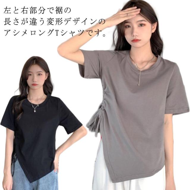 タック レディース 可愛い アシンメトリー トップス アシンメトリー 半袖 裾変形 ギャザー カットソー 着痩せ 細見え 個性的 モード系 春 夏 お洒落 ゆったり きれいめ カジュアル 通勤 オフィス
