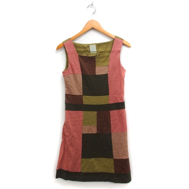 【中古】シビラ SYBILLA 配色 パッチワーク ワンピース ノースリーブ ひざ丈 フレア コットン 綿 M グリーン 緑 ピンク