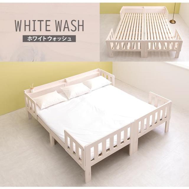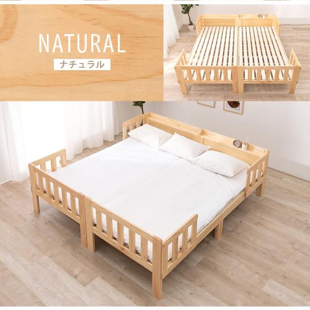 1台だとベッドガード付きの1人用ベッド、2台を連結すると家族で広々使える大きなキングサイズベッドに。敷布団が使えるロングサイズで、スマホも置ける宮棚付き