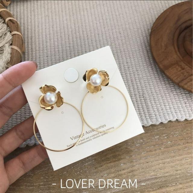 2way ゴールドフラワーピアス サークル ピアス S925ポスト SILVER925ポストゴールド フープ フープピアス 花 フラワーパール 大振り 女性 韓国アクセ 可愛い 925針 アレルギー フラワーパールリングピアス