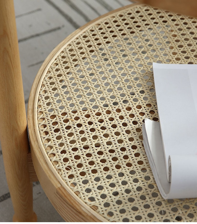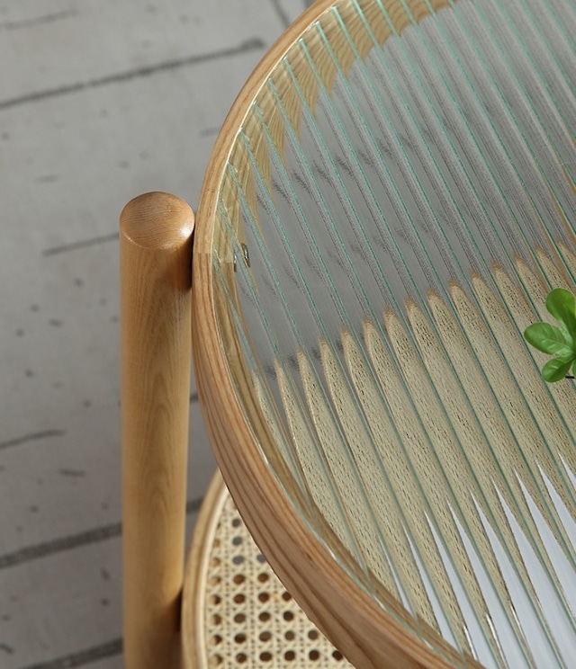 トレンドのラタンで編まれた下部の天板と美しい木目が特徴的な無垢材のフレームは