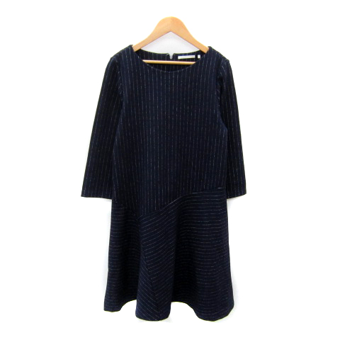 【中古】ドゥクラッセ DoCLASSE ワンピース ひざ丈 長袖 ラウンドネック ストライプ柄 M 紺 ネイビー レディース