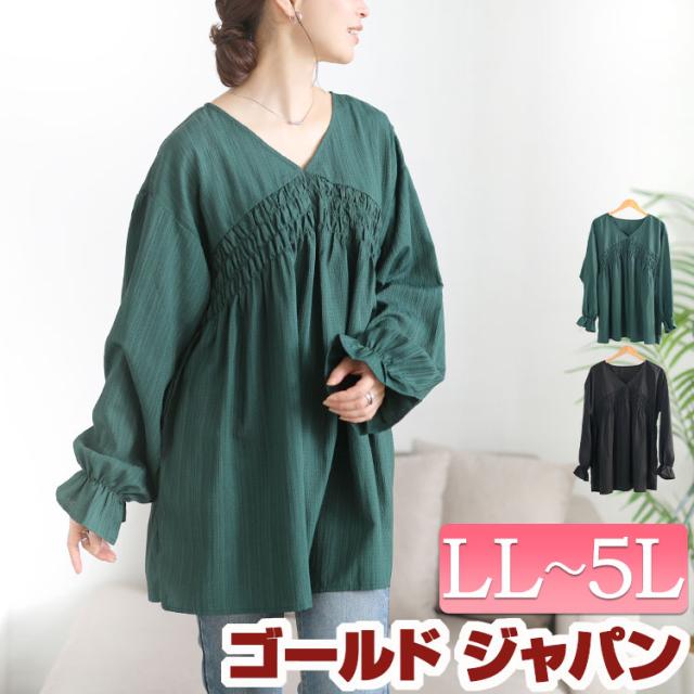 春新作 大きいサイズ レディース チュニック キャンディスリーブシャーリングチュニック 長袖チュニック Vネックチュニック 長袖 ロング Vネック キャンディースリーブ シャーリング ギャザー フレア ゆったり 秋服 春服 LL 2L 3L 4L 5L ブラック グリーン ゴールドジャパン