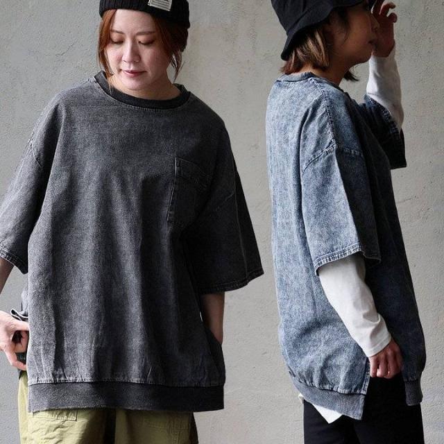 Tシャツ 6分袖 レディース クルーネック リブ切り替え ケミカルデニム 綿100 コットン 薄手 柔らか 軽い ゆったり 大きいサイズ 体型カバー お尻隠れる カジュアル パティ