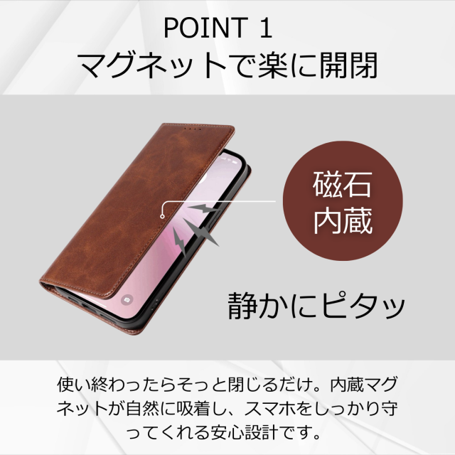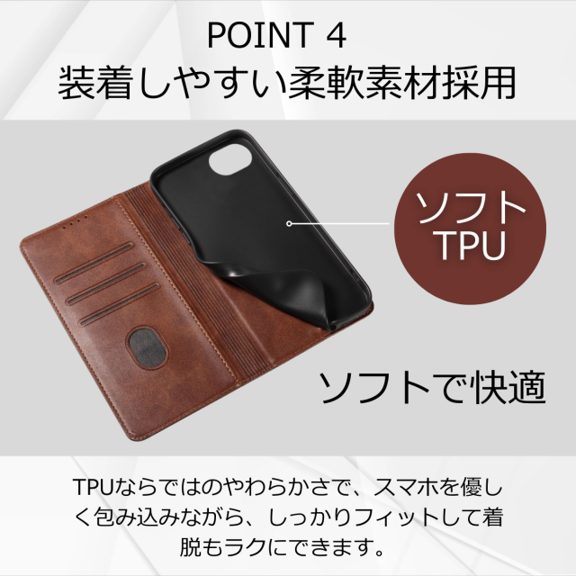 外側は高級感のあるPUレザー、内側は衝撃をやわらげるTPU素材を採用し、大切な端末をしっかり保護します。