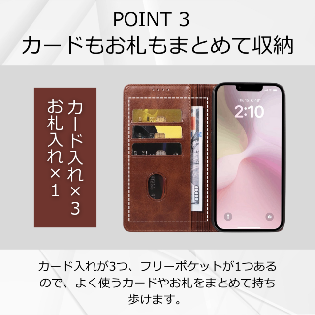 収納:カードポケット×3、紙幣やレシートが入るフリーポケット×1