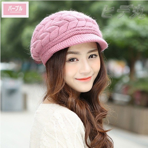 帽子 ニット帽 つば付き 帽子 レディース 秋冬 ニットキャスケット ニットキャップ 無地 防寒 女性 大きめ パープル