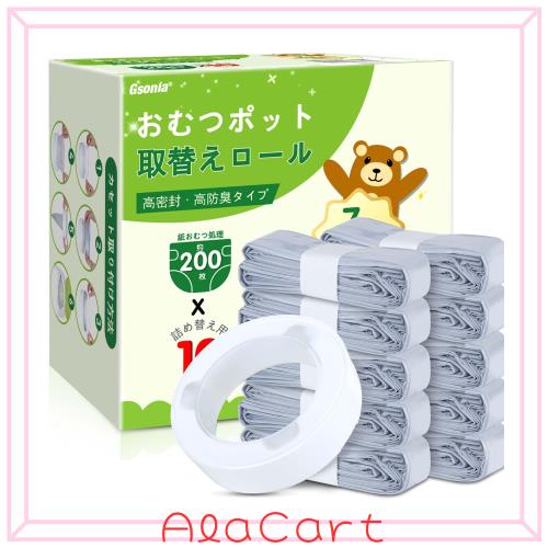 経済的:1パッケージにおむつゴミ箱用詰め替え袋10枚と空カートリッジ1個入り。 20%追加の長さ(1個は約1カ月分) ※赤ちゃん用紙おむつ1日6個の場合 約200枚分を処理できる。従来のプリロードカセットと比べてコスト削減、省スペース、ゴミ削減ができ、家計と環境にやさしい