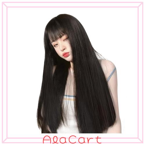 Vigorousウィッグ ロング 黒 ストレート ブラック 女装 かつら 黒髪 自然 フルウィッグ 小顔 地雷女 韓国風 ぱっつん前髪 耐熱wigネット