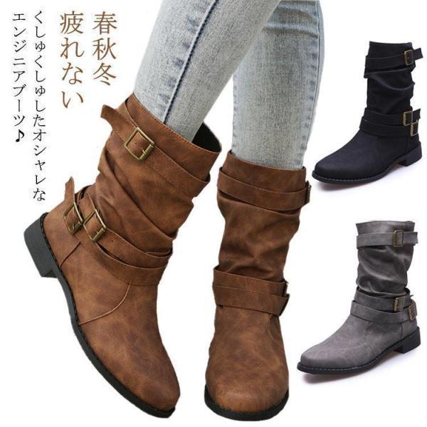 エンジニアブーツ ショートブーツ ミドルブーツ ベルト付き レディース ルーズブーツ S&L くしゅくしゅ 靴 ローヒール ぺたんこ 疲れない 春秋冬 大きい