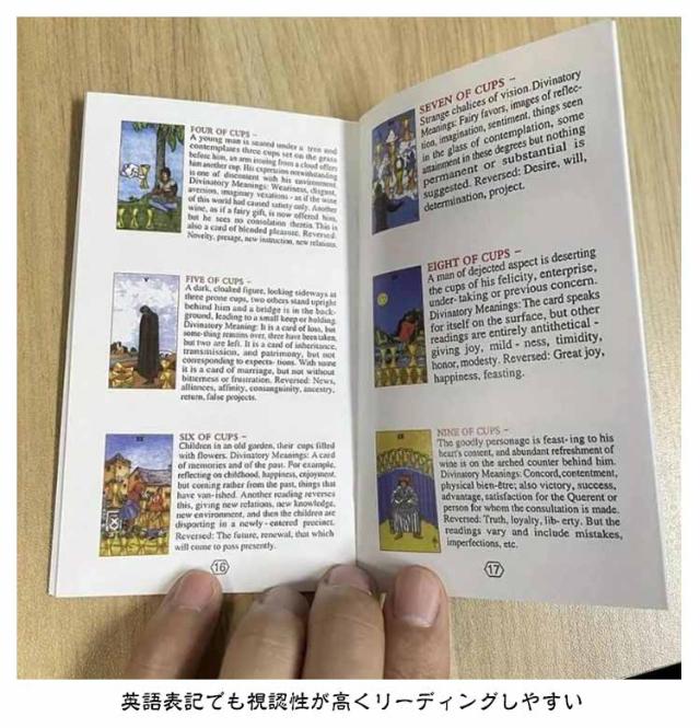 | サイズについての説明 | 【商品仕様】 セット内容:セット内容:大アルカナ22枚 小アルカナ56枚(計78枚) カードサイズ:縦約12cm 横約7cm 箱サイズ:縦約13cm 横約7cm 厚み約3cm ※日本語の説明書は付属しておりません。 ※カードの重さにより、箱が少し柔らかいため、 使用を繰り返すと破れやすくなる場合があります。 ※カードの滑りが非常に良いため、シャッフル時にカードがスムーズに動きすぎることがあります。慎重に扱うことで、 より快適に使用していただけます。 ※洗浄の際は表面の印刷保護にご注意ください ※商品のサイズは手作業で測定させて頂いておりますので、若干の誤差があります。 |