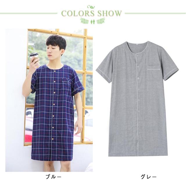 スリーパー 綿メンズ紳士シャツワンピース 前開き スリーパー半袖 パジャマ 男女兼用スリーパーパジャマ ホテルパジャマ 綿メンズ紳士シャツワンピース 快適 ロング丈 吸汗 部屋着 通気 快眠 紳士 ワンピー 男性用 入院用 介護用 ブルー
