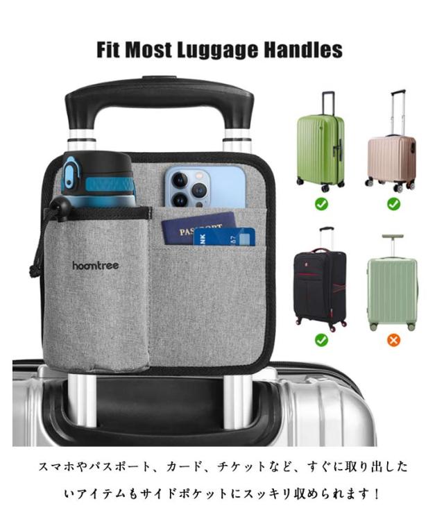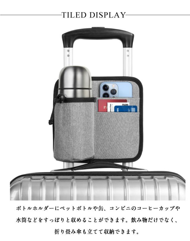 | 【材スーツケース用】【ボトルホルダー】【使いやすさ】 ボトルホルダーにペットボトルや缶、コンビニのコーヒーカップや水筒などをすっぽりと収めることができます。飲み物だけでなく、折り畳み傘も立てて収納できます。 スマホやパスポート、カード、チケットなど、すぐに取り出したいアイテムもサイドポケットにスッキリ収められます! 丈夫で耐久性の高いオックスフォード生地に仕上がっています。 お手持ちのスーツケースに取り付けられるので、荷物の多い時でも両手が塞がっていても大活躍間違いなしです! 軽量で折りたためるので、使用しない時もかさばることなくスーツケースに収納できます。 | |