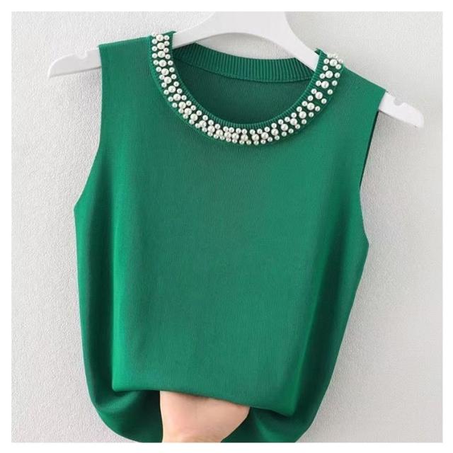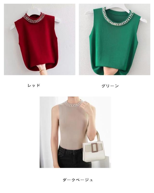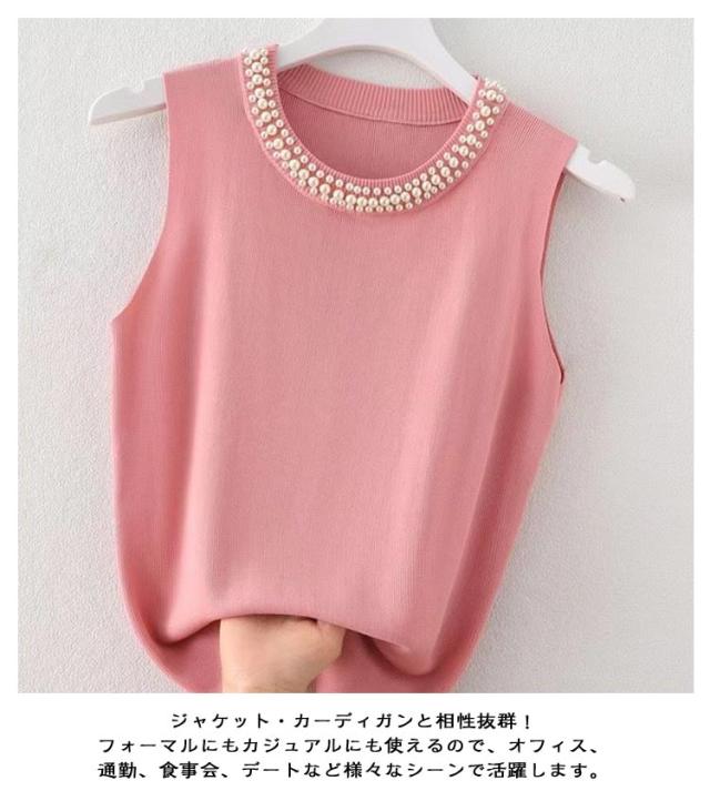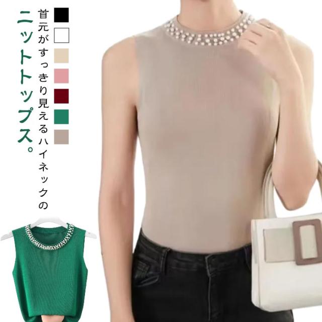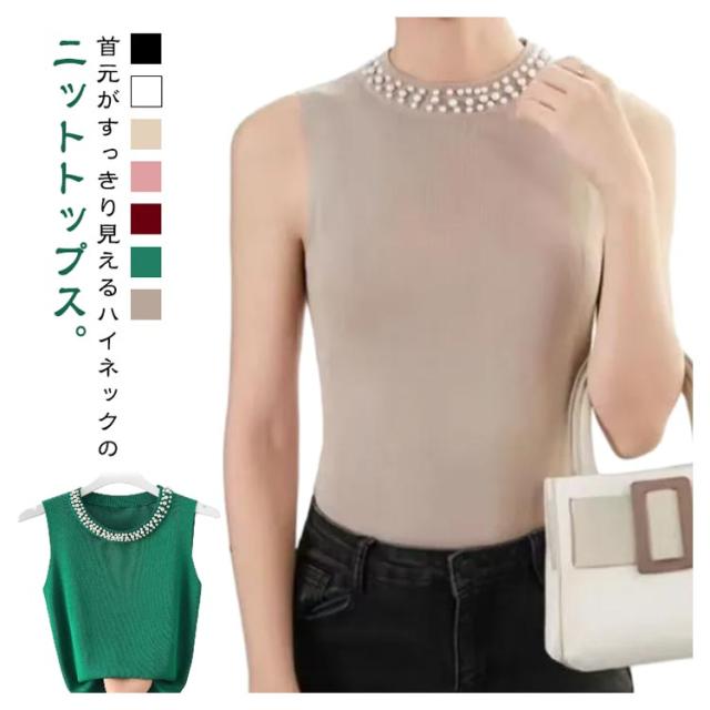 キャミソール パール付き ノースリーブ レディース サマーニット 春夏 リブニット タンクトップ 無地 ニットトップス ハイネック ノースリーブ カットソー スーツインナー フェミニン インナー きれいめ 大人 通勤 20代 30代 40代 50代