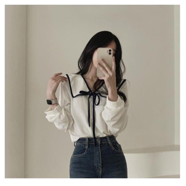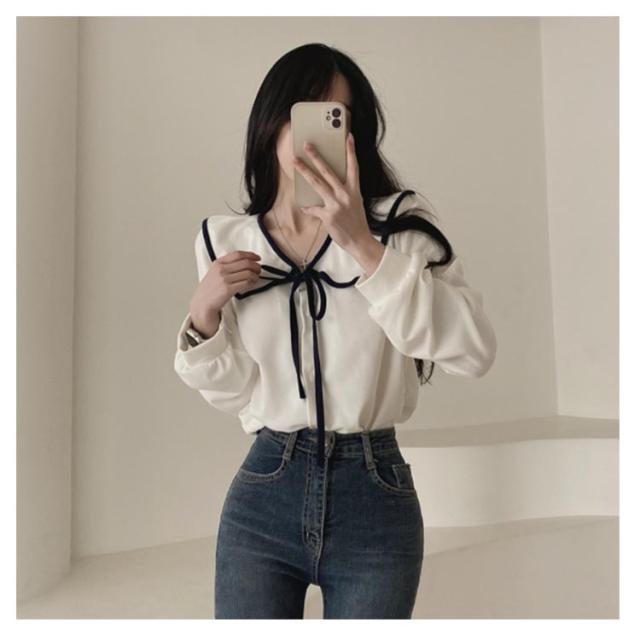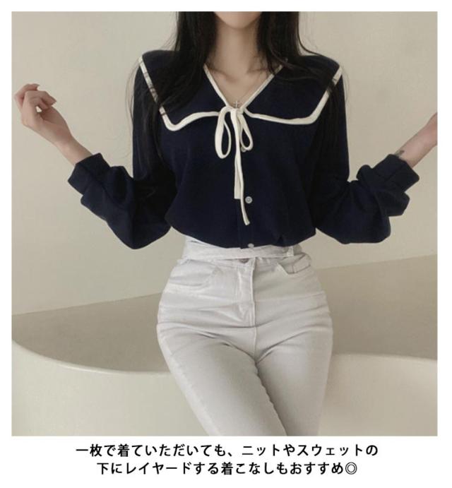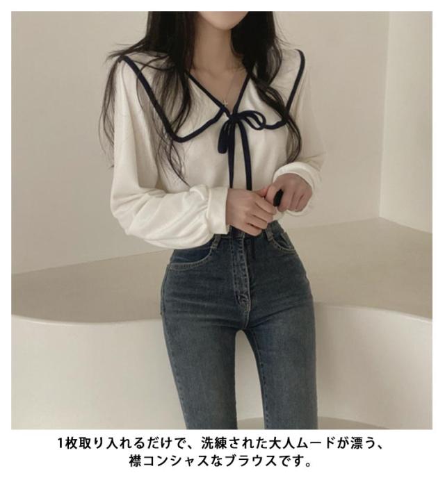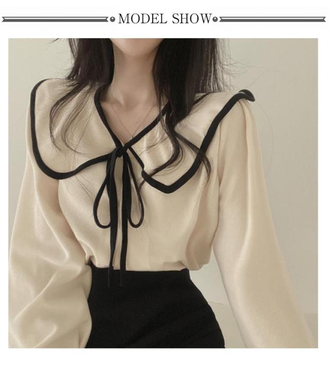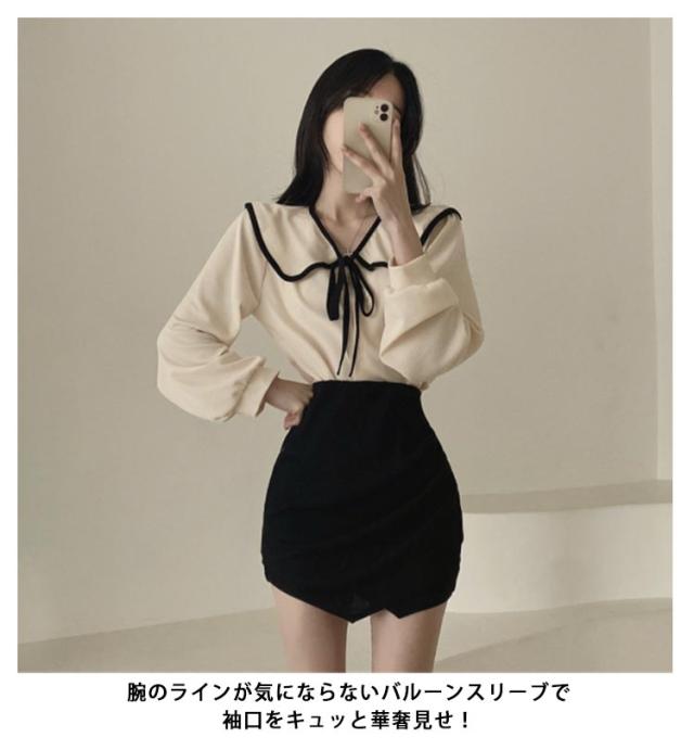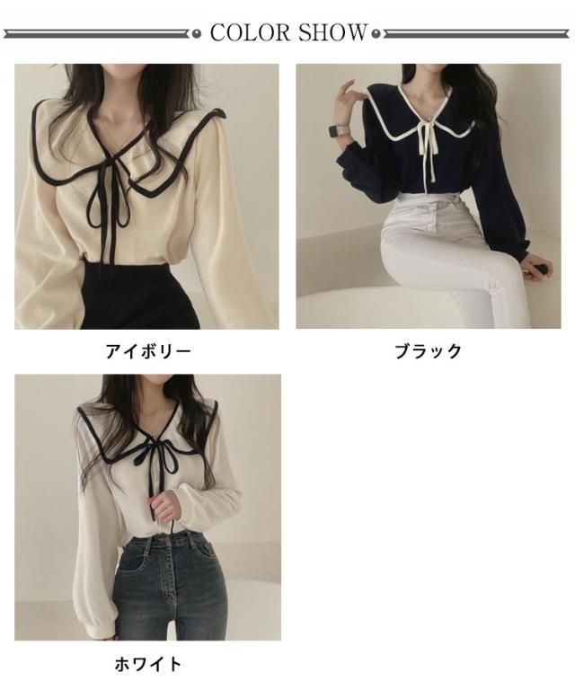 フロントボタン リボン ブラウス フリル スカラップ 通勤 パイピング ボタン ビッグカラー シャツ ビッグカラー オーバーサイズ オケージョン セレモニー オフィスカジュアル トップス フェミニン ガーリー レトロ ホワイト ブラック