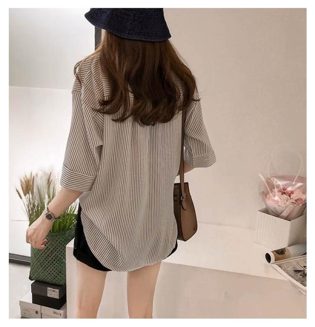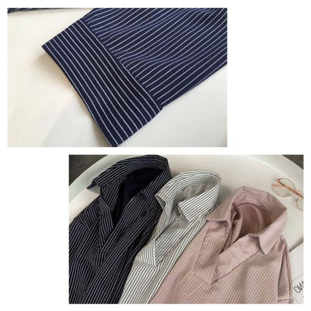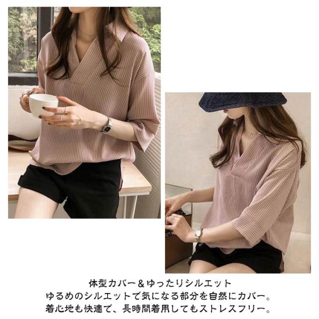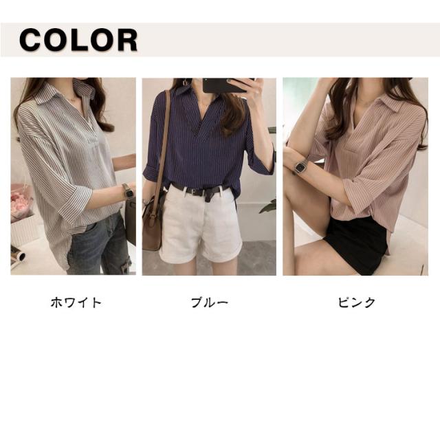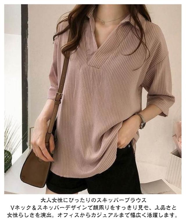 上品 レディース ストライプ スキッパーブラウス 七分袖 秋 スキッパー シャツ 開襟シャツ トップス カジュアル 夏 ブラウス かわいい おしゃれ スキッパーシャツ Vネック ゆったり 体型カバー オフィス 白 春 ブルー ピンク