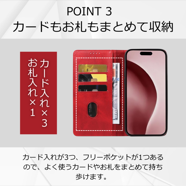 収納:カードポケット×3、紙幣やレシートが入るフリーポケット×1