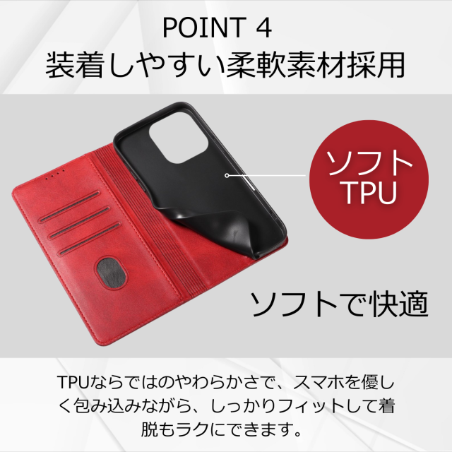 外側は高級感のあるPUレザー、内側は衝撃をやわらげるTPU素材を採用し、大切な端末をしっかり保護します。
