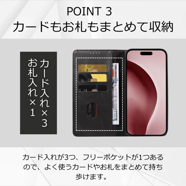 収納:カードポケット×3、紙幣やレシートが入るフリーポケット×1