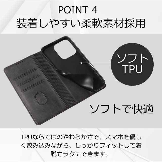 外側は高級感のあるPUレザー、内側は衝撃をやわらげるTPU素材を採用し、大切な端末をしっかり保護します。