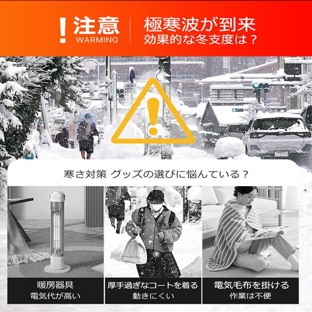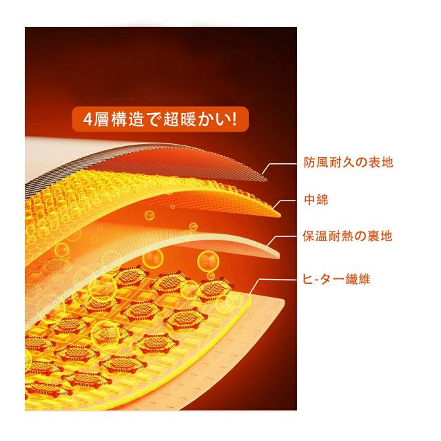【日本製繊維ヒーター&4層構造】 日本製ヒーターで感電しない、遠赤外線発熱で放射ゼロ、より安全安心です。 さらに、高品質の中綿を使用し、発熱と保温が同時に、電源が入れずに着ても、暖かいヒートベストです。 21個のヒーターを内蔵しており、前後の各エリアに科学的に配置しています。内面には蓄熱材があり、体から発する熱を有効的に反射させ、同時にお腹、腰、首周りを温めます。 血液循環の効果を改善し、体全体を暖かくぽかぽかにします。