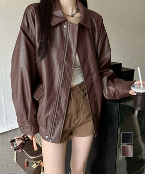 トレンド感たっぷりのレディースドロップショルダージップアップPUレザージャケット。