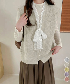 ネックラインにレースをあしらい、リボンがポイントになったニットベスト。