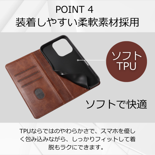 外側は高級感のあるPUレザー、内側は衝撃をやわらげるTPU素材を採用し、大切な端末をしっかり保護します。