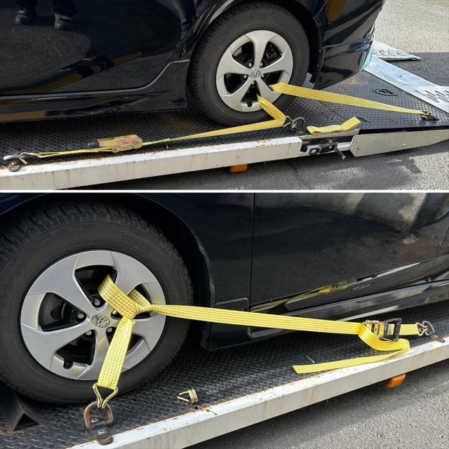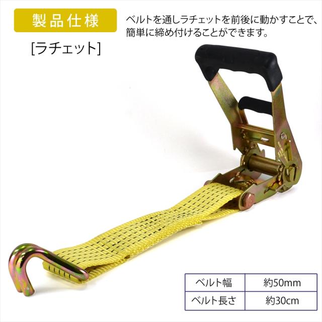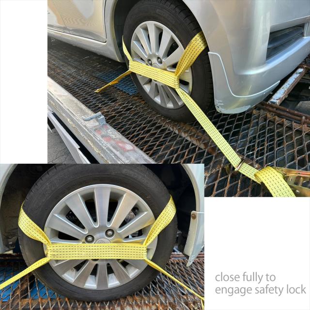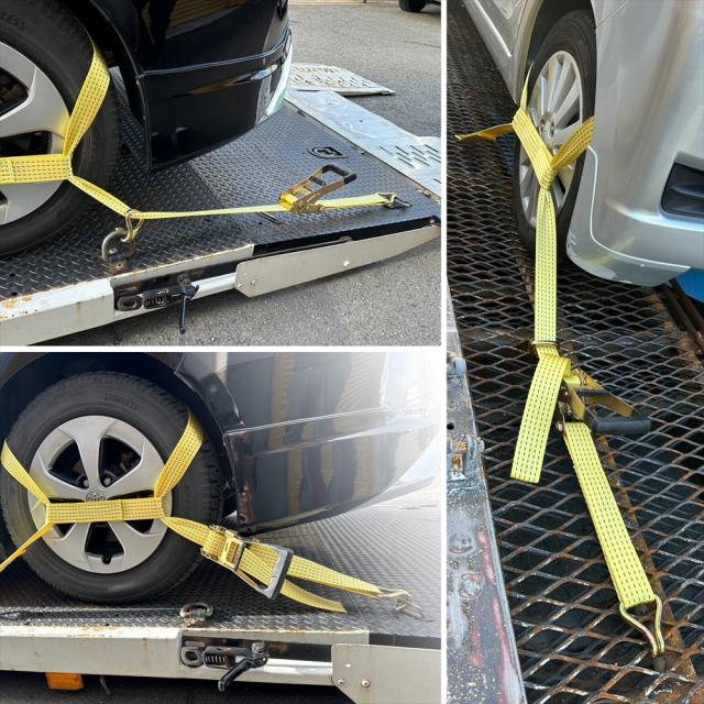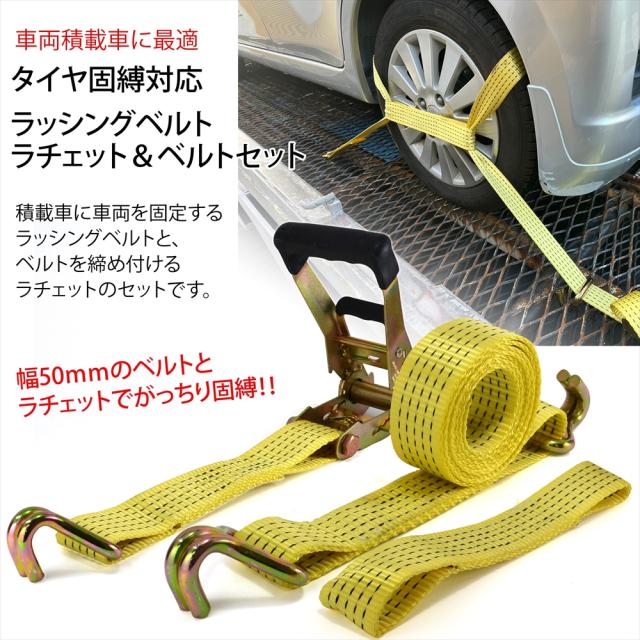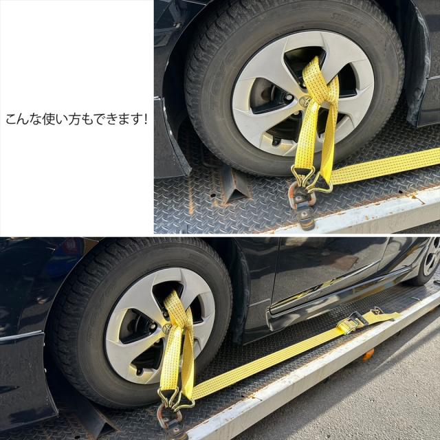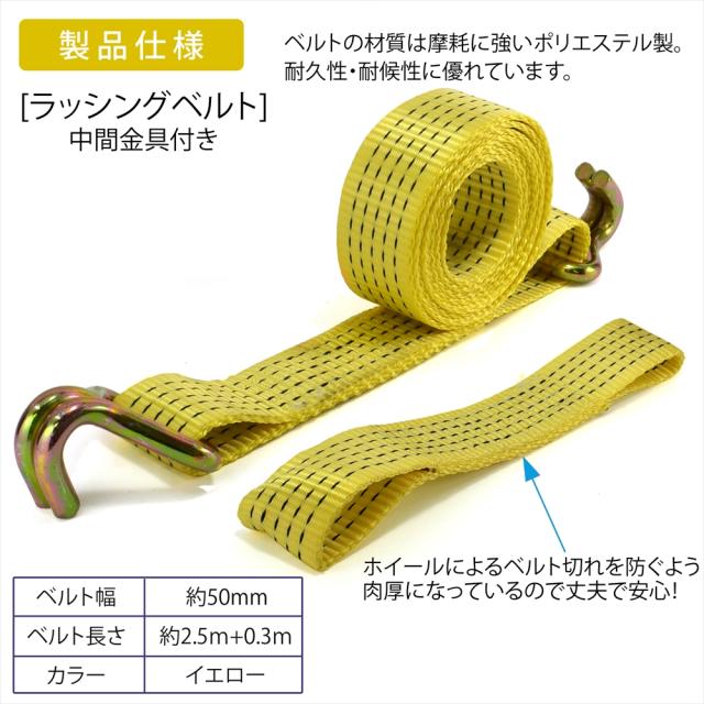 ラッシングベルト 中間金具付き 2組セット 車両積載車 ラチェット式 タイヤ固縛 耐荷重 5t ベルト幅 50mm 2.5m 積車 積載車 車 バイク 荷締め 荷物固定 トラック タイヤ イエロー 軽トラ レッカー用品 レッカー 運搬 搬送