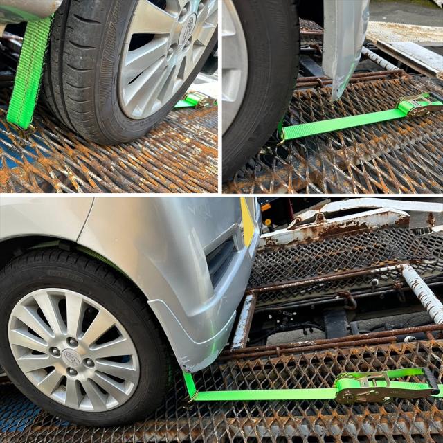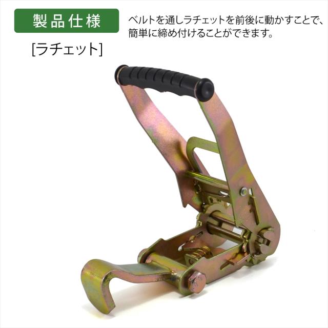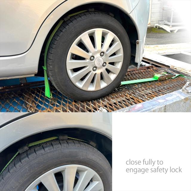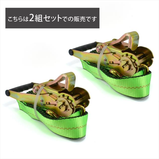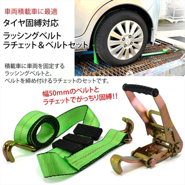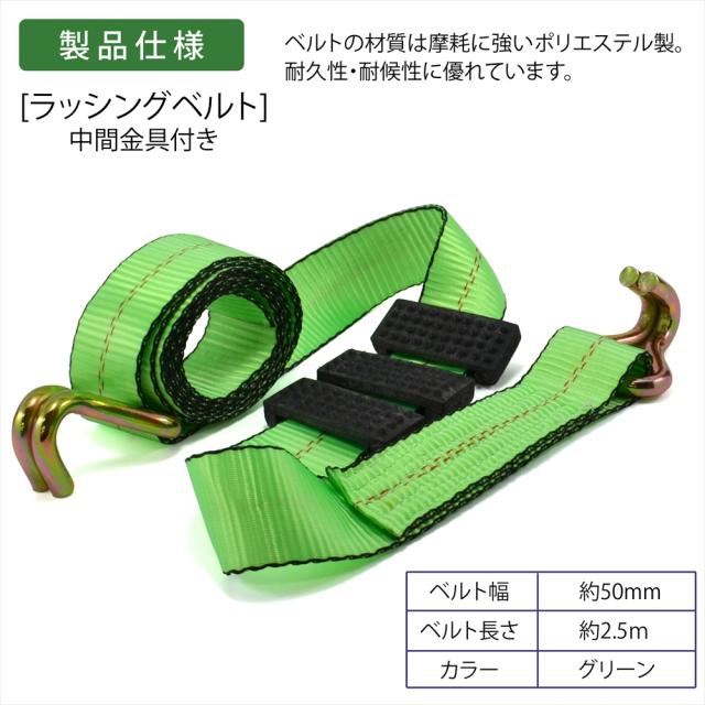 ラッシングベルト 中間金具付き 2組セット 車両積載車 ラチェット式 タイヤ固縛 対応 ベルト 耐荷重 5トン ベルト幅 50mm 2.5m 積車 積載車 車 クルマ バイク 荷締め 荷物固定 トラック タイヤ グリーン 軽トラ ラッシング レッカー用品 レッカー 運搬 搬送