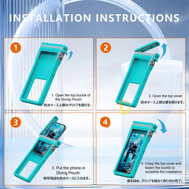 ご注意:ご 使用の前に必ず携帯の代わりに一枚の紙をケースに入れて、防水ケースは水没して30分間の防水試験を行 ってください。