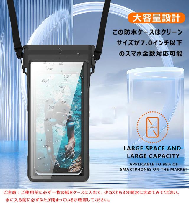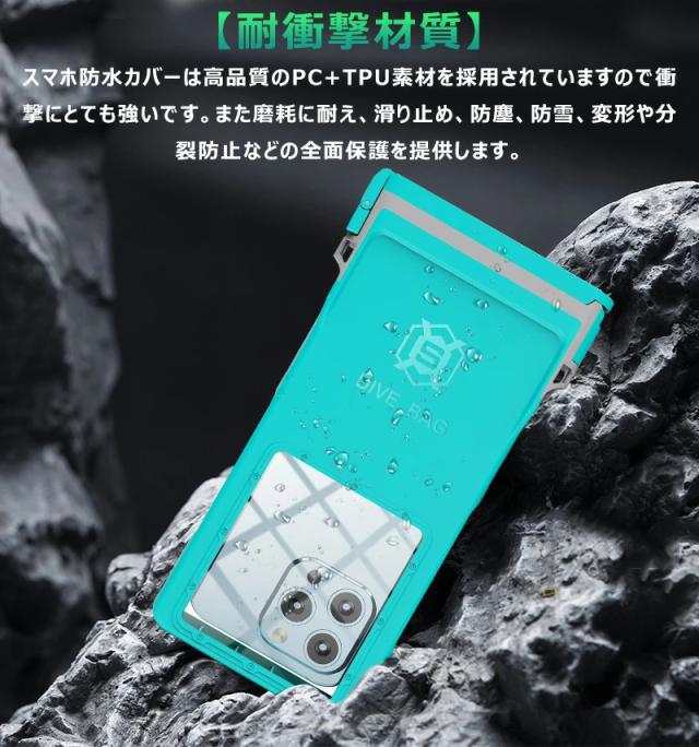 ? スマホ防水カバーは高品質のPC+TPU素材を採用されていますので衝撃にとても強いです。また磨耗に耐え、滑り止め、防塵、防雪、変形や分裂防止などの全面保護を提供します。