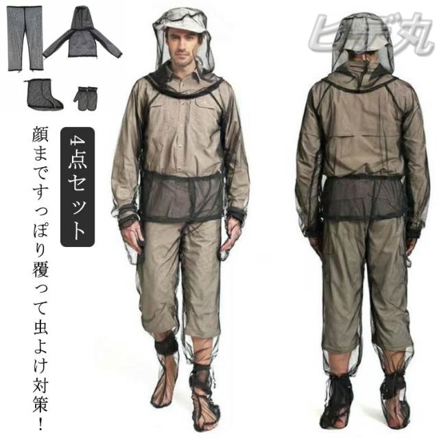 【4点セット】 虫除けウェア 足カバー 蚊よけ パーカー 顔まですっぽり メッシュ 防虫ネット 虫除け 耐久性 手袋 ズボン 防虫 虫よけウェア 虫よけネット 畑用 採集 釣り 軽量 【4点セット】 速乾性 通気性