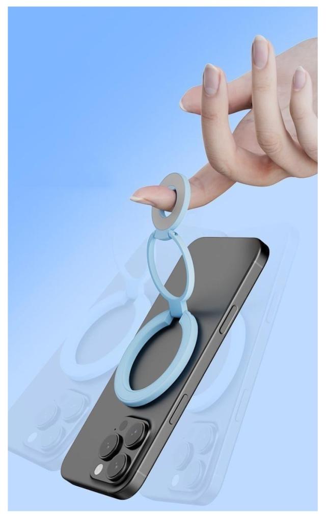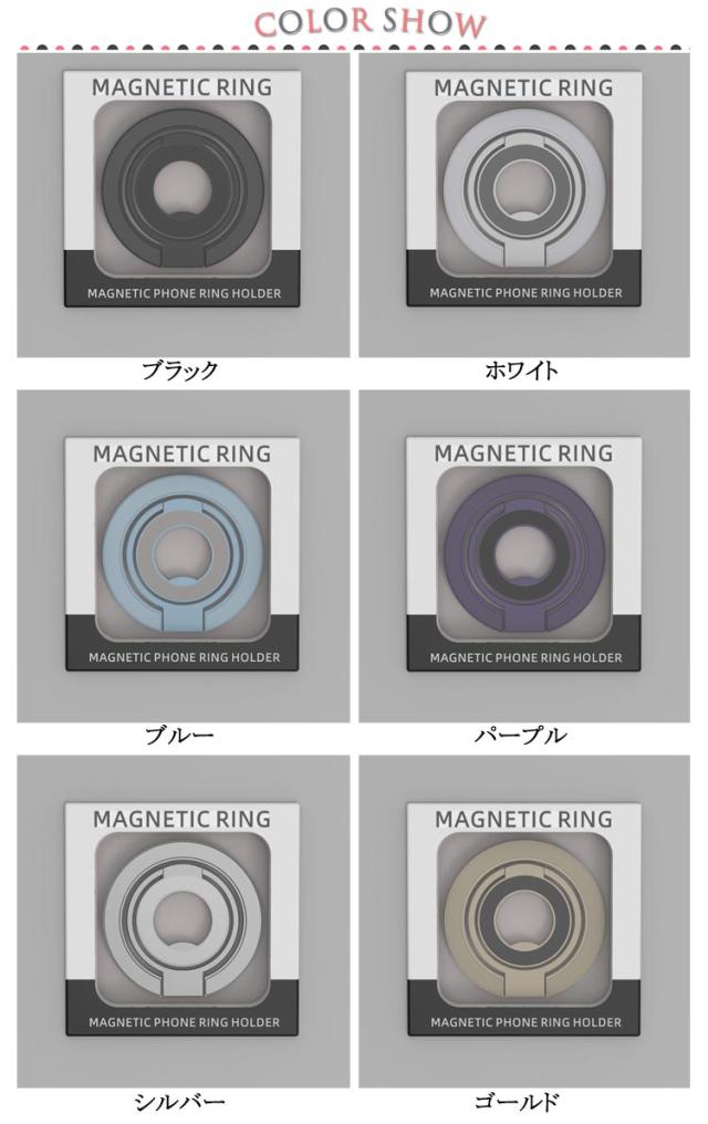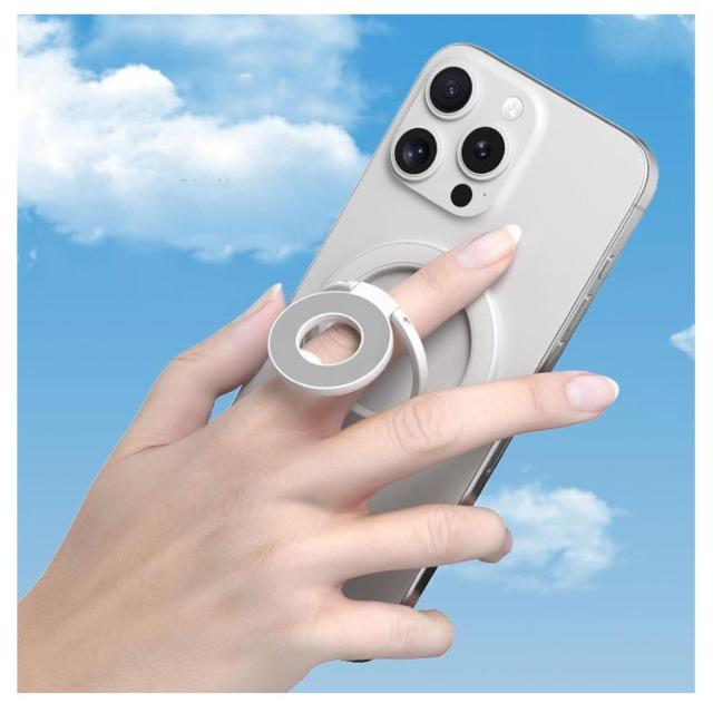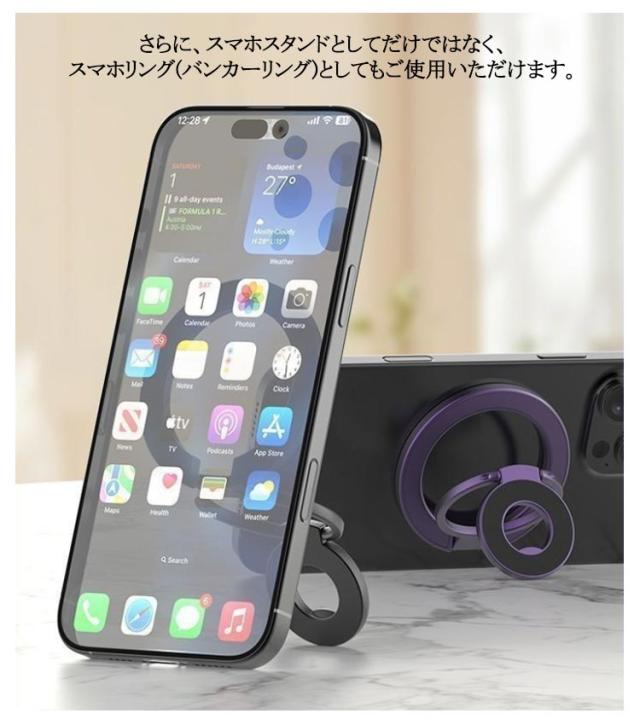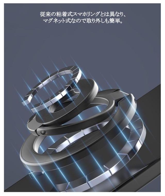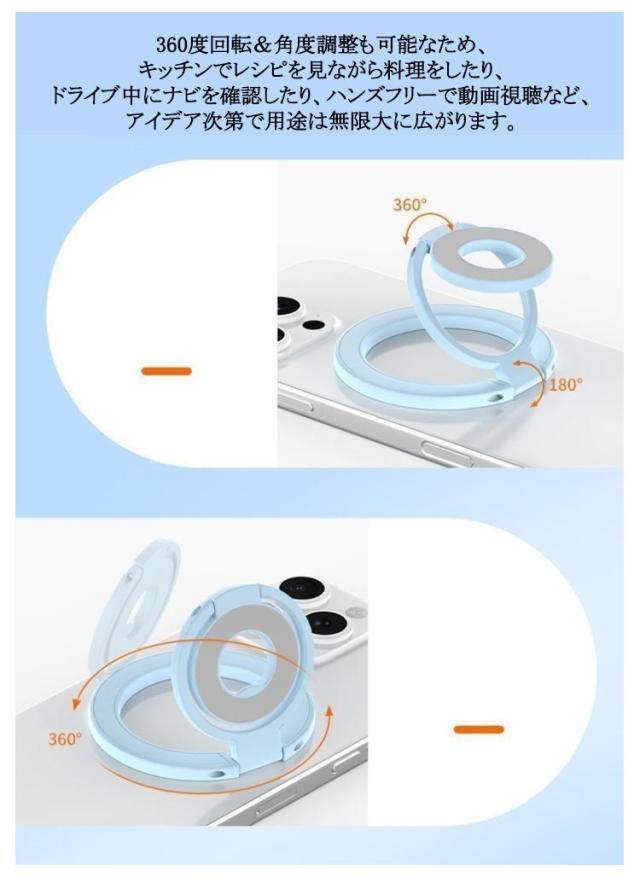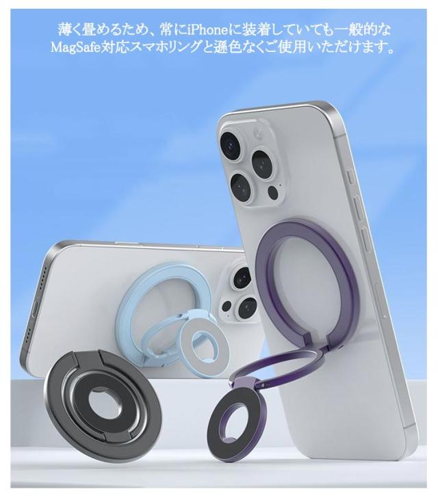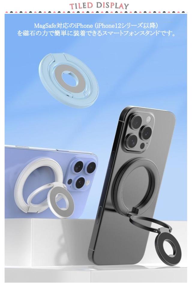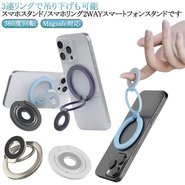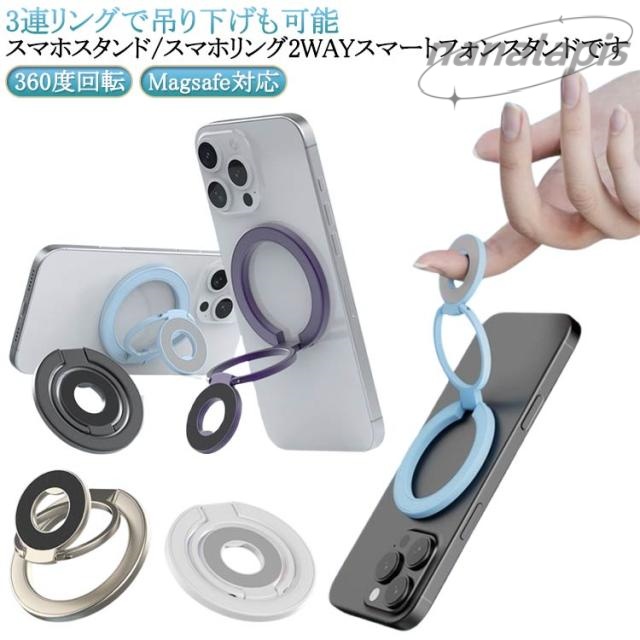 | スマホスタンド/スマホリング2WAYスマートフォンスタンドです。【3連リングで吊り下げも可能】 MagSafe対応のiPhone (iPhone12シリーズ以降) を磁石の力で簡単に装着できるスマートフォンスタンドです。 従来の粘着式スマホリングとは異なり、マグネット式なので取り外しも簡単。 薄く畳めるため、常にiPhoneに装着していても一般的なMagSafe対応スマホリングと遜色なくご使用いただけます。 さらに、スマホスタンドとしてだけではなく、スマホリング(バンカーリング)としてもご使用いただけます。 360度回転&角度調整も可能なため、キッチンでレシピを見ながら料理をしたり、ドライブ中にナビを確認したり、ハンズフリーで動画視聴など、アイデア次第で用途は無限大に広がります。 | |